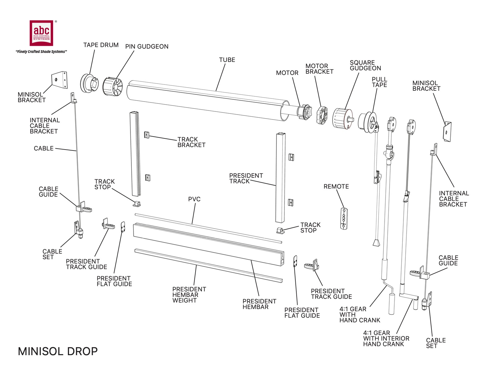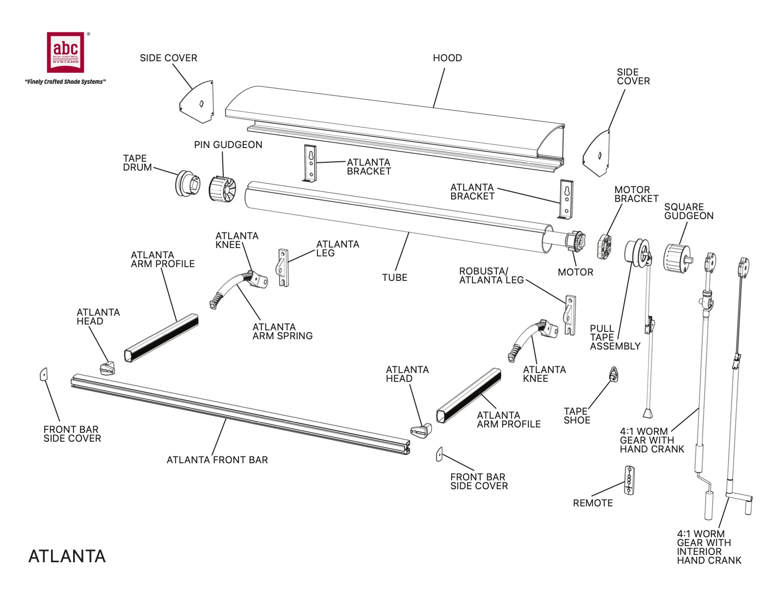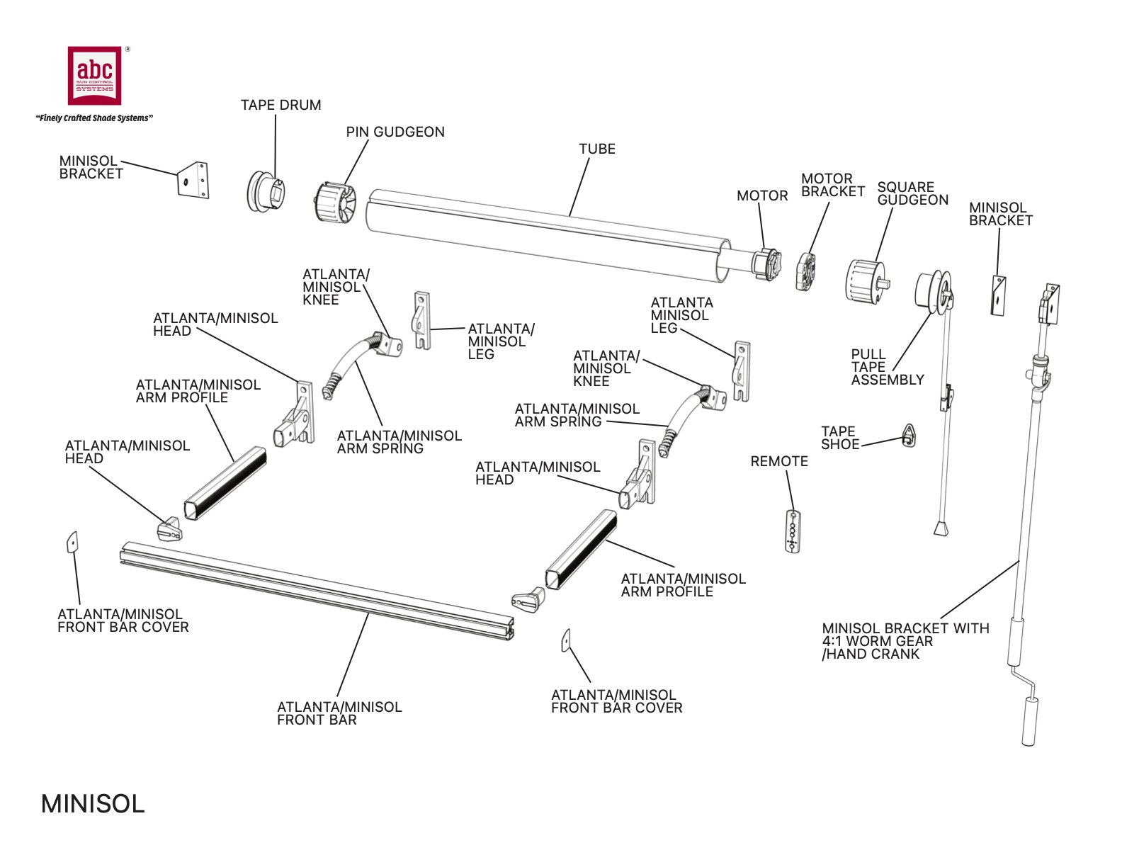 The Atlanta and Minisol small drop arm window awnings both utilize common components; spring-loaded drop arms, standard 43 mm roller tubes, small front bars, and standard tape operating systems. The Atlanta incorporates a stylish extruded aluminum hood to protect the fabric and provide a more finished appearance.