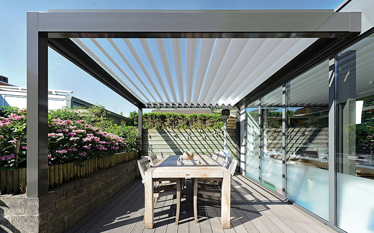 With the B150 (XL) pergola you are entering the world of Outdoor Living. The B150 is our basic model and has a lot of functional options. This pergola has also a manually adjustable version which does not have the LED lighting nor any other electrical option.