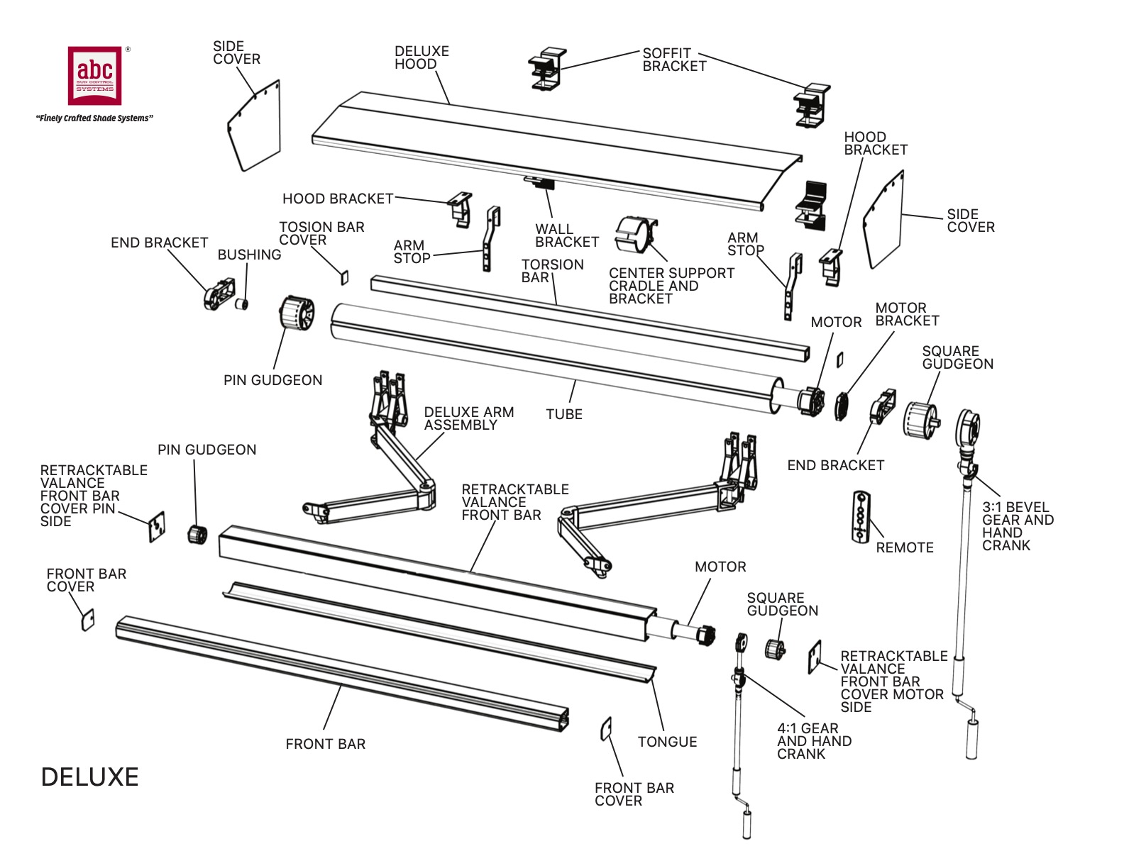 The abc Deluxe lateral arm retractable awning is based on the enhanced system developed in Sweden by EGE Westin AB. This system incorporates the latest advancements including a variable pitch adjustment for the arms and an energy absorbing shoulder. abc imports the critical components of this system from EGE Sweden, and assembles them at our North Hollywood factory to produce one of the most reliable time proven lateral arm awning systems available today. Hardware is available in White, Sand and Bronze colors.
