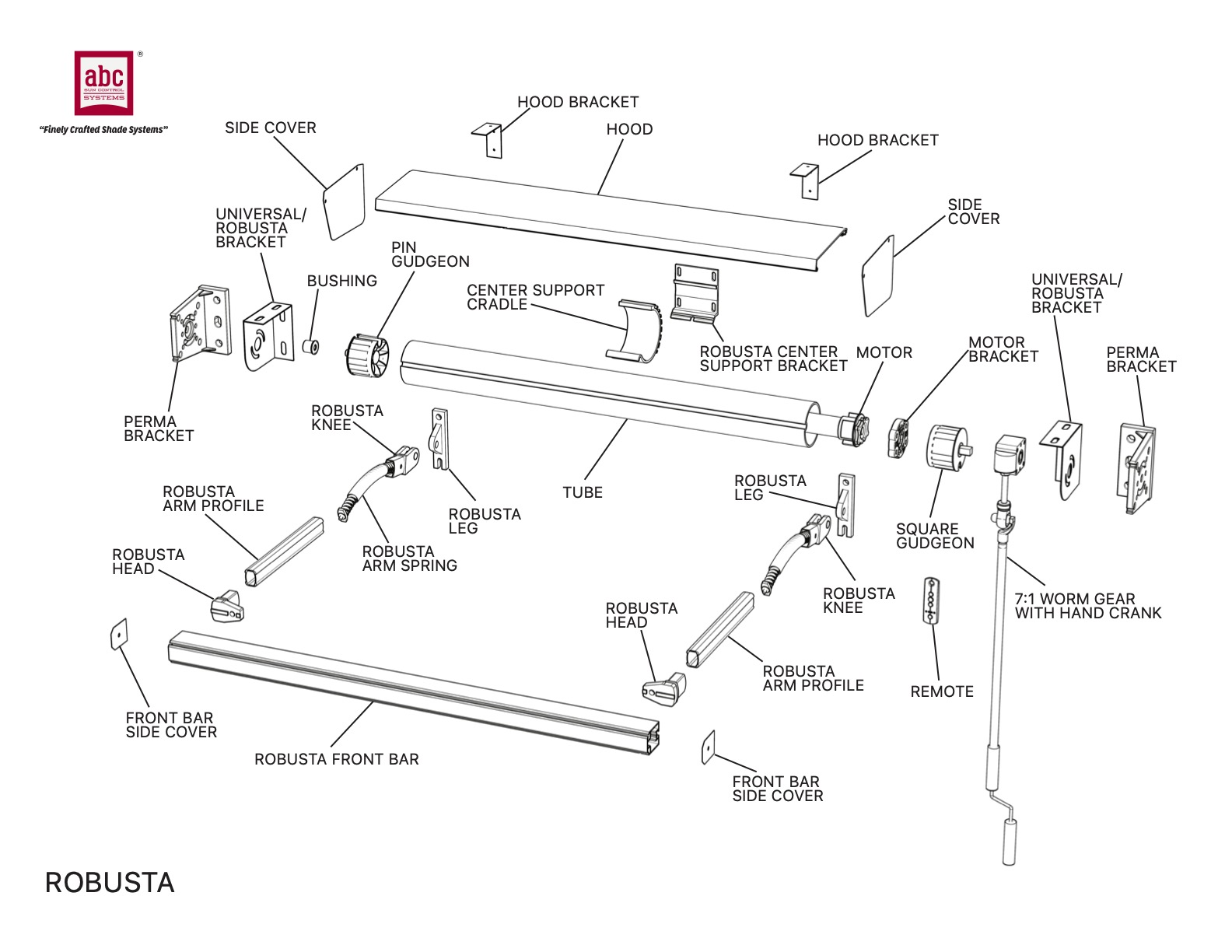 The robust components allow for wide width applications that can span up to 25’ or more. A heavy guage stylish aluminum hood is also available for protection on the fabric and mechanisms.