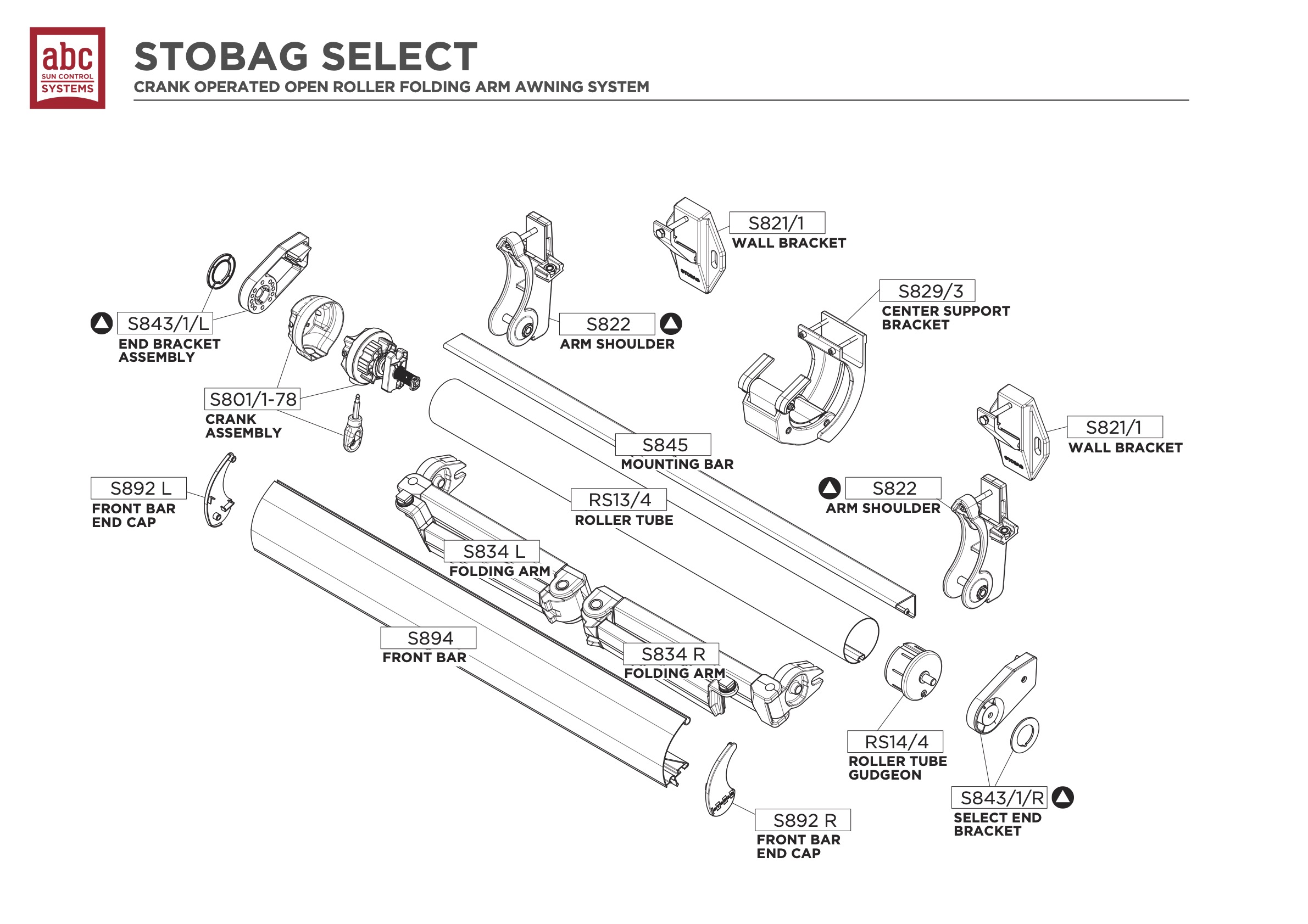 The Select/Ombramatic is a compact folding arm awning with a hidden triangular mounting bar, solid aluminum folding arms with integrated tension springs, double stainless steel cables, and cable protection over the center joint.